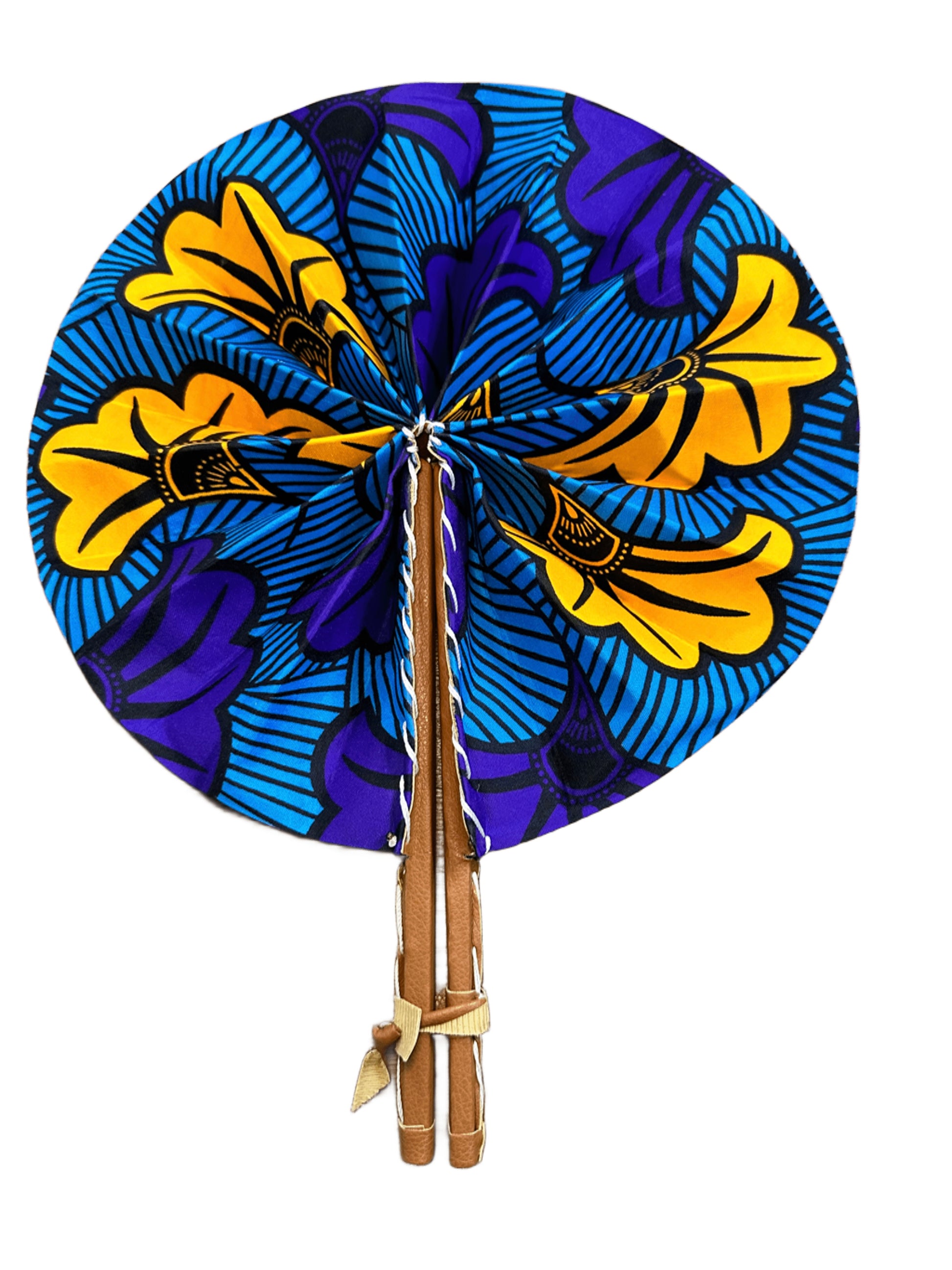 Nuestros abanicos están hechos a mano con telas wax africanas, conocidas por sus colores vibrantes y sus estampados únicos llenos de historia y simbolismo. Son plegables, ligeros y prácticos, perfectos para llevar en el bolso y refrescarte con estilo en cualquier momento. Cada abanico es una pieza única que combina tradición africana con un toque moderno y elegante.