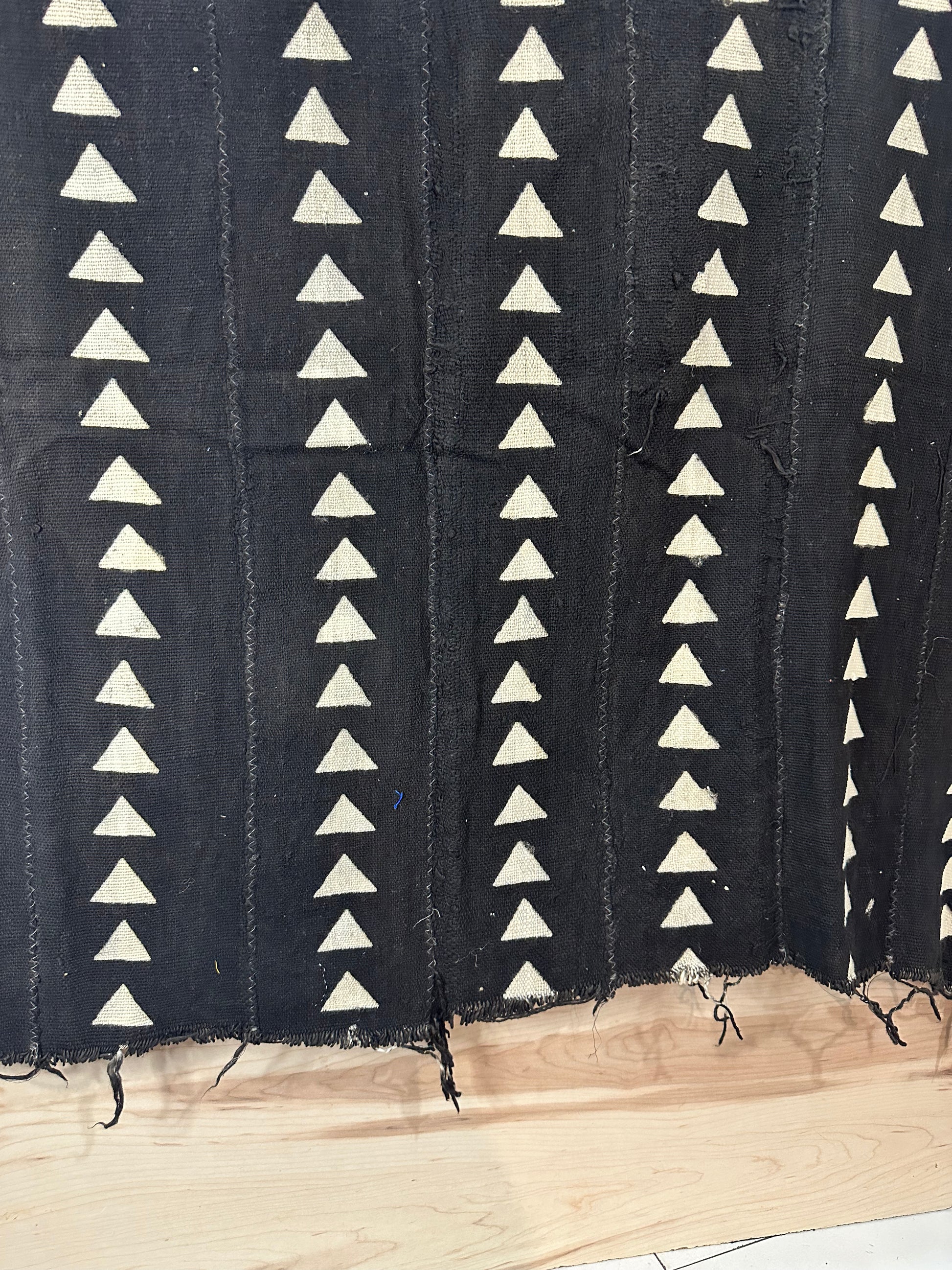 Los tejidos bogolán se elaboran a partir de pequeñas bandas de algodón tejidas por artesanos que se unen unas a otras hasta formar piezas de un tamaño en ocasiones considerable y que se decoran posteriormente, en diferentes fases, con tintes de origen natural. La tela presenta desgaste o signos de imperfecciones es lo que hace su belleza.