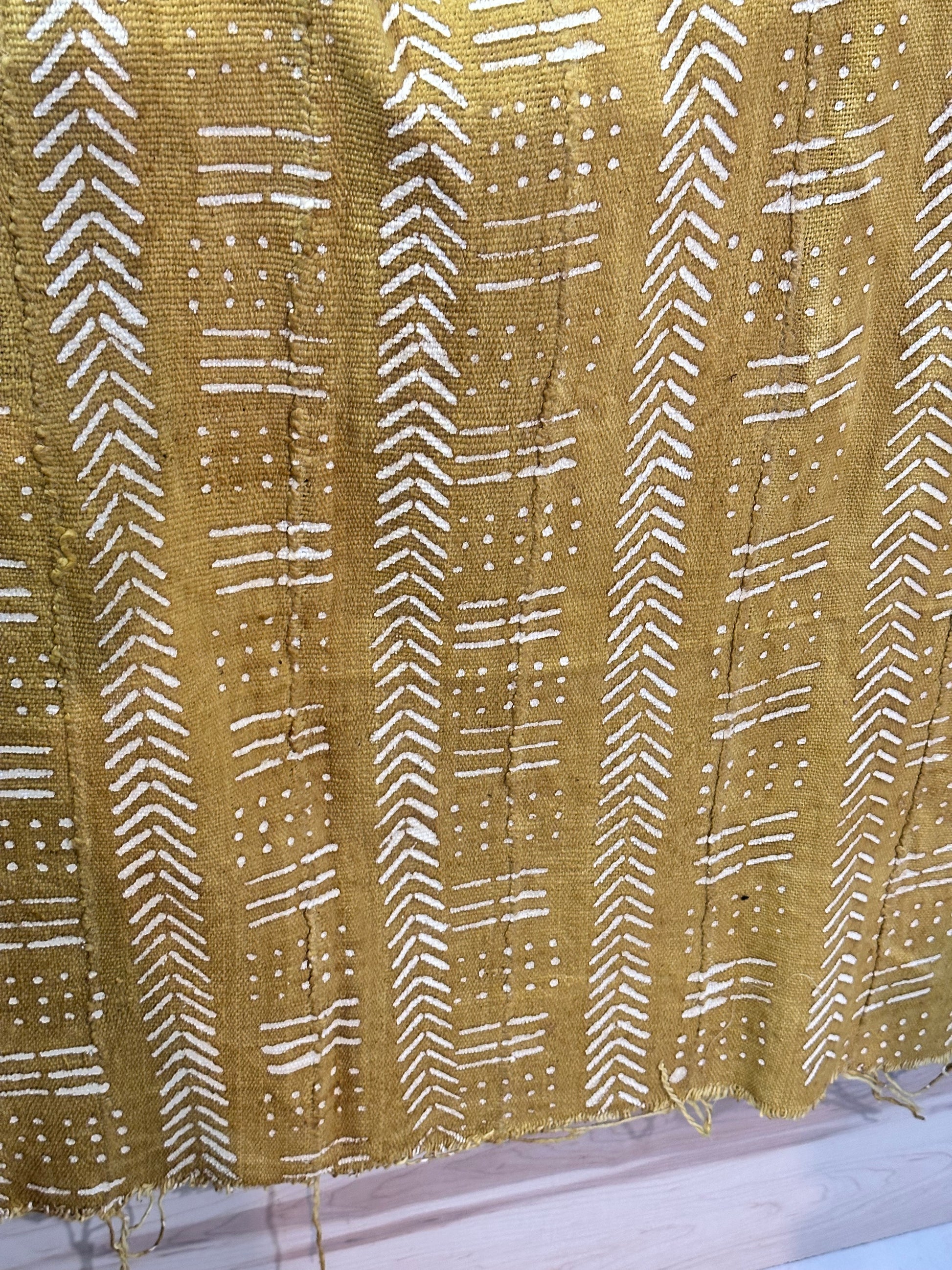 Los tejidos bogolán se elaboran a partir de pequeñas bandas de algodón tejidas por artesanos que se unen unas a otras hasta formar piezas de un tamaño en ocasiones considerable y que se decoran posteriormente, en diferentes fases, con tintes de origen natural. La tela presenta desgaste o signos de imperfecciones es lo que hace su belleza.