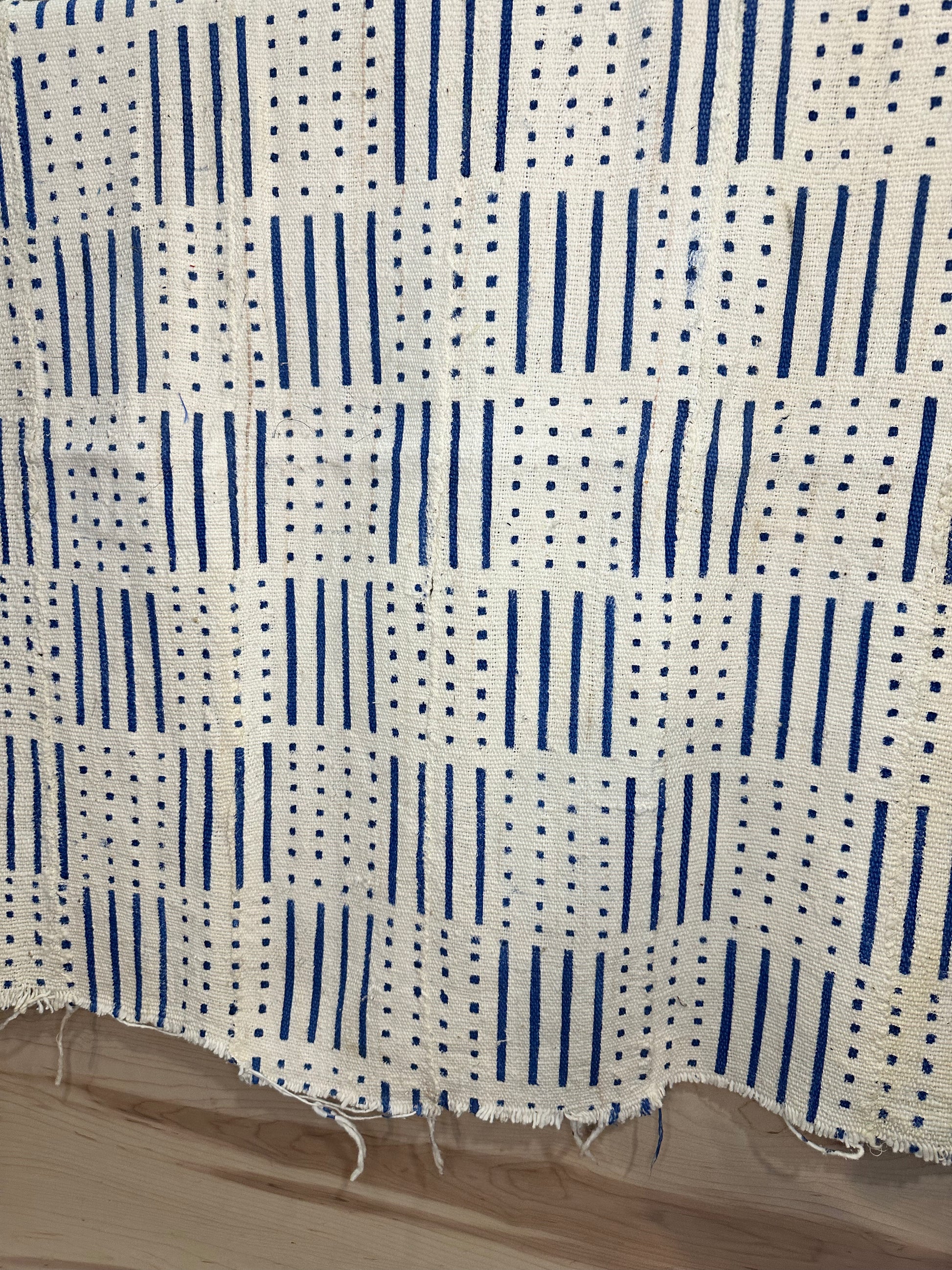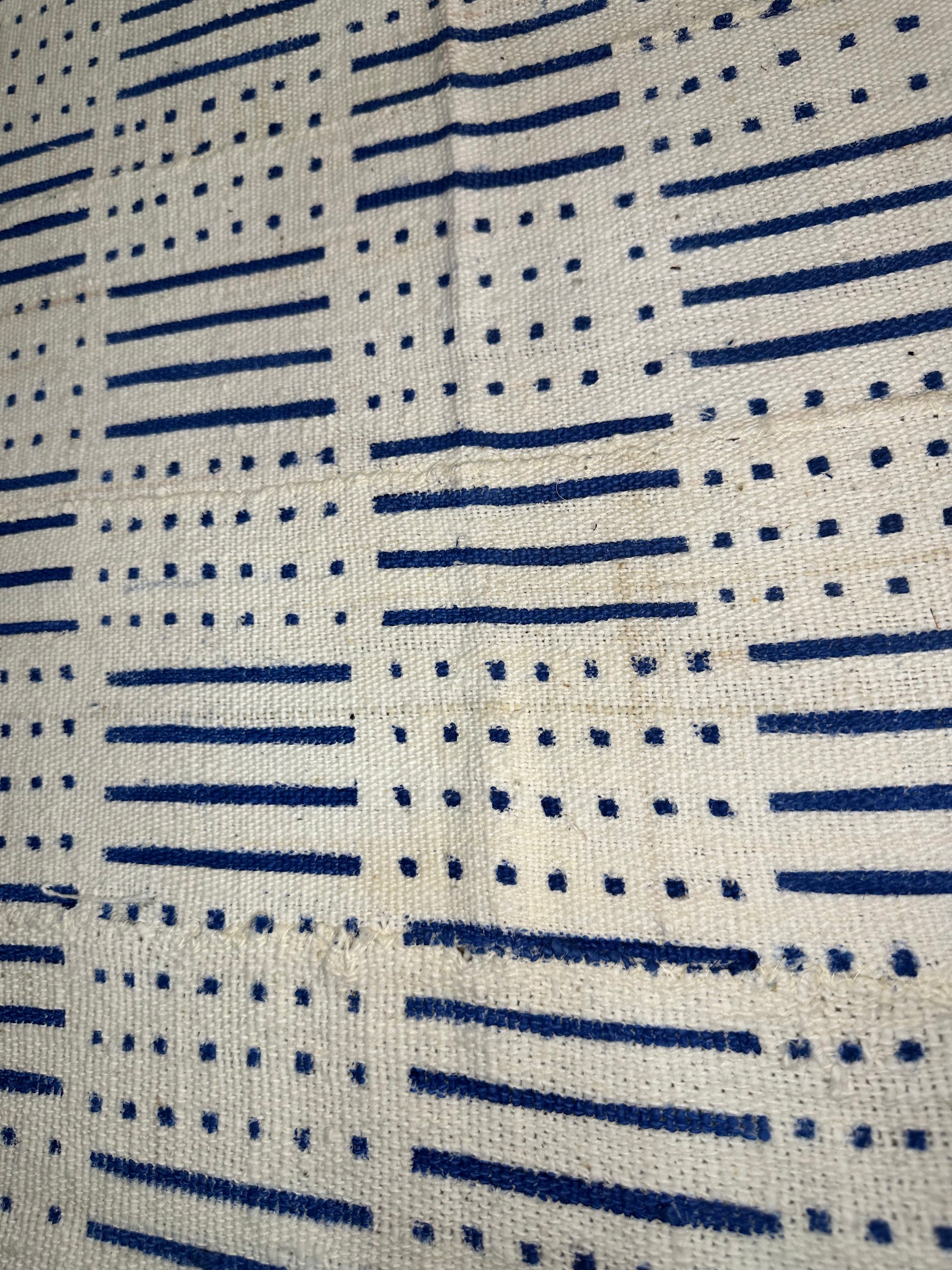 Los tejidos bogolán se elaboran a partir de pequeñas bandas de algodón tejidas por artesanos que se unen unas a otras hasta formar piezas de un tamaño en ocasiones considerable y que se decoran posteriormente, en diferentes fases, con tintes de origen natural. La tela presenta desgaste o signos de imperfecciones es lo que hace su belleza.